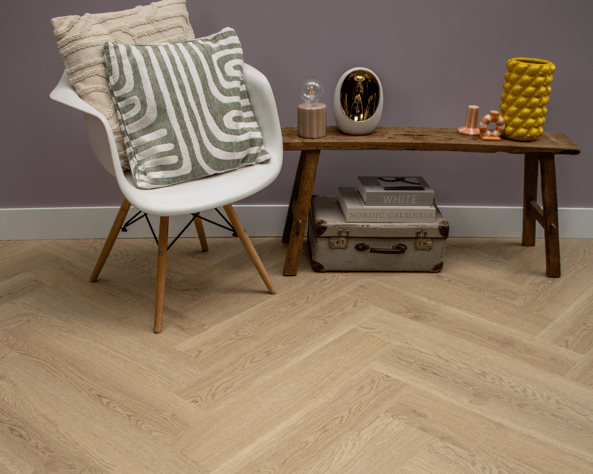 Kies je voor de Ganges Visgraat Plak, dan kies je voor de charme van een echte houten vloer, verpakt in modern en waterbestendig PVC. Dankzij het klassieke visgraatpatroon krijgt jouw interieur direct een speels, maar tegelijkertijd zeer luxueus karakter. Het patroon trekt de aandacht zonder overheersend te zijn en sluit verrassend gemakkelijk aan bij nagenoeg elke inrichtingstijl. De warme, lichte beigetonen nodigen direct uit en zorgen voor een luchtige uitstraling. Als dryback plakvloer is hij de perfecte keuze in combinatie met vloerverwarming en biedt hij de meest strakke, drempelloze afwerking door het hele huis – klaar voor onbezorgd woonplezier in elke ruimte.