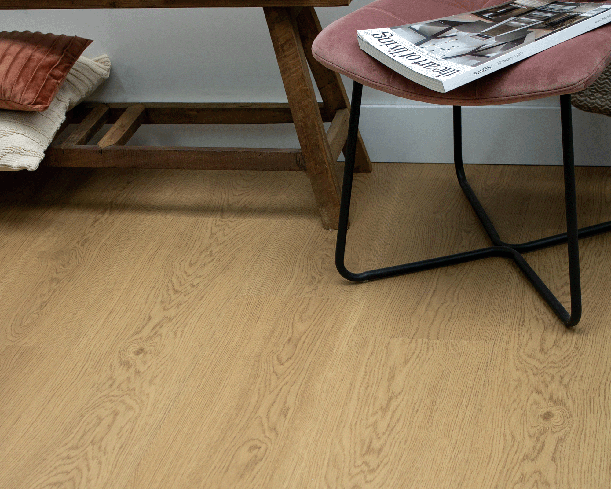 Kies je voor de Kaukasus Plak, dan kies je voor de charme van een echte houten vloer, verpakt in modern en waterbestendig PVC. De realistische details, variaties in de tekening en het tijdloze plankontwerp zorgen voor een rustig fundament onder jouw inzetbare inrichting. Hierdoor is de vloer veelzijdig te combineren met zowel strakke als meer landelijke meubelen. De gebalanceerde, warme neutrale tonen bieden verrassend veel combinatiemogelijkheden. Als dryback plakvloer is hij de perfecte keuze in combinatie met vloerverwarming en biedt hij de meest strakke, drempelloze afwerking door het hele huis – klaar voor onbezorgd woonplezier in elke ruimte.