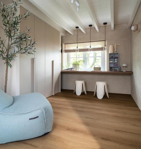 De royale plankmaat van 154 cm bij 23,3 cm geeft je interieur langere lijnen en een ruimtelijker effect. Daardoor is deze vloer breed inzetbaar: van woonkamer en keuken tot slaapkamer en werkruimte. Ook in de badkamer is PVC een passende keuze. Extra comfortabel: geschikt voor zowel vloerverwarming als vloerkoeling.