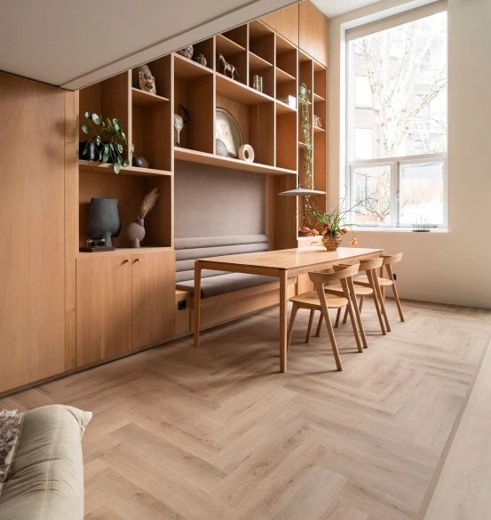 Zoek je een vloer die in meerdere ruimtes werkt? SDS 77822  – PVC Plak Visgraat XL is toepasbaar in onder andere de woonkamer, keuken, slaapkamer en zelfs de badkamer. De XL stroken van 73 × 14,6 cm geven het visgraatpatroon extra rust en een ruimtelijk effect. Daarbij is de vloer geschikt voor vloerverwarming en -koeling voor comfortabel wonen, het hele jaar door.